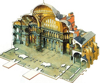 La arquitectura bizantina surge tras la caída del Imperio Romano de Occidente, fusionando elementos romanos con influencias orientales. Destaca por sus iglesias con grandes cúpulas y mosaicos detallados.. Uno de los mejores ejemplos es la Basílica de Santa Sofía, en Constantinopla, cuya cúpula influyó en la arquitectura posterior.